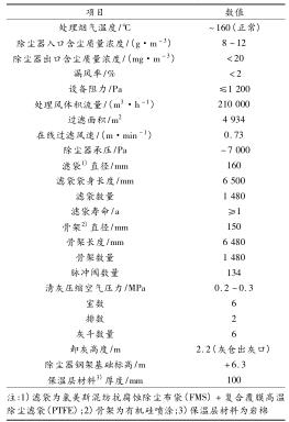 (2) 新建布袋除塵及氣力輸灰氦氣流量計。采用長袋低壓脈沖袋式(外濾式)除塵器,煙氣體積流量為 210 000 m 3 /h,初 始 含 塵 質(zhì) 量 濃 度 為 8 ~12 g/m 3 ,除塵占地面積為 20 m 2 (5 m ×4 m)。除塵器主要由本體、壓縮空氣系統(tǒng)、控制系統(tǒng)、輸灰系統(tǒng)組成。除塵器后進脫硫塔煙塵質(zhì)量濃度≤20 mg/m 3 。除塵器的總阻力≤1 200 Pa。新建布袋除塵器型號為 LCMD-4934,設(shè)計參數(shù)見表 2,其中清灰方式采用離線清灰,除塵器布置方式為矩形布置,電氣控制采用可編程邏輯控制器(PLC)。