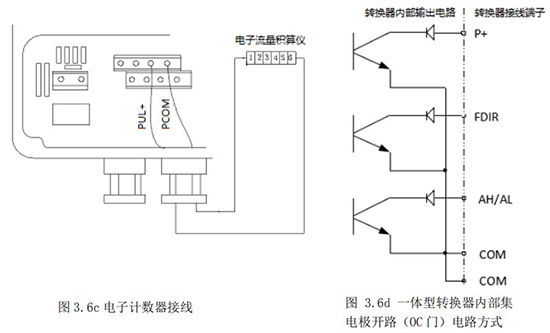 3.4.5 頻率(脈沖)、上下限報(bào)警、流向標(biāo)示等輸出均為集電極開(kāi)路的電平輸出信號(hào)。