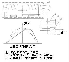 熱分布式tmf的工作原理如圖1所示,薄壁測量管3外壁繞著兩組兼作加熱器和檢測元件的繞組2,組成惠斯登電橋,由恒流電源5供給恒定熱量,通過線圈絕緣層、管壁、流體邊界層傳導(dǎo)熱量給管內(nèi)流體。邊界層內(nèi)熱的傳遞可以看作熱傳導(dǎo)方式實(shí)現(xiàn)的。在流量為零時(shí),測量管上的溫度分布如圖下部虛線所示,相對(duì)于測量管中心的上下游是對(duì)稱的,由線圈和電阻組成的電橋處于平衡狀態(tài);當(dāng)流體流動(dòng)時(shí),流體將上游的部分熱量帶給下游,導(dǎo)致溫度分布變化如實(shí)線所示,由電橋測出兩組線圈電阻值的變化,求得兩組線圈平均溫度差δt。便可按下式導(dǎo)出質(zhì)量流量qm,即