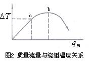 在總的熱傳導(dǎo)系數(shù)a中,因測量管壁很薄且具有相對(duì)較高熱導(dǎo)率,儀表制成后其值不變,因此a的變化可簡化認(rèn)為主要是流體邊界層熱導(dǎo)率的變化。當(dāng)使用于某一特定范圍的流體時(shí),則a、cp均視為常量,則質(zhì)量流量僅與繞組平均溫度差成正比,如圖2 oa 段所示。 oa段為儀表正常測量范圍,儀表出口處流體不帶走熱量,或者說帶走熱量極微;超過a點(diǎn)流量增大到有部分熱量被帶走而呈現(xiàn)非線性,流量超過b點(diǎn)則大量熱量被帶走。