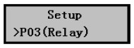 1) 在分體式超聲波液位計(jì)正常工作時(shí)按擊Mode鍵進(jìn)入?yún)?shù)設(shè)置菜單后按擊▼鍵選擇到P03(Relay)繼電器設(shè)置菜單,如右圖所示。