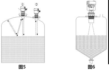 6、對于頂部為平面的錐形容器,四線制超聲波液位計(jì)應(yīng)盡量安裝在頂部中央,這樣可以保證測量到容器底部,如圖6所示。
